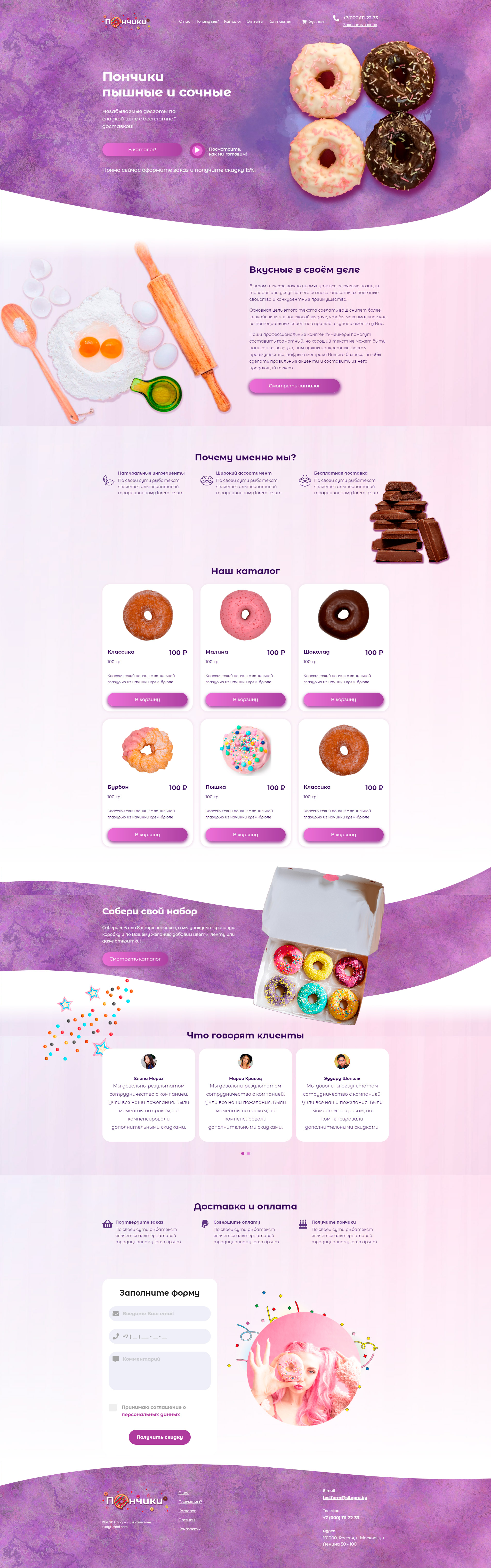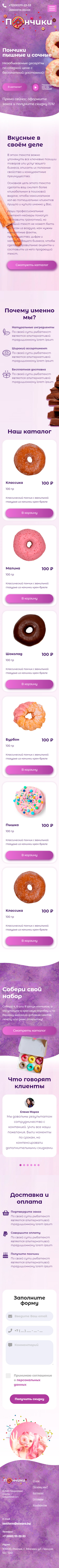 - Промоблок "Пончики пышные и сочные" с кнопкой призыва к действию "В каталог"