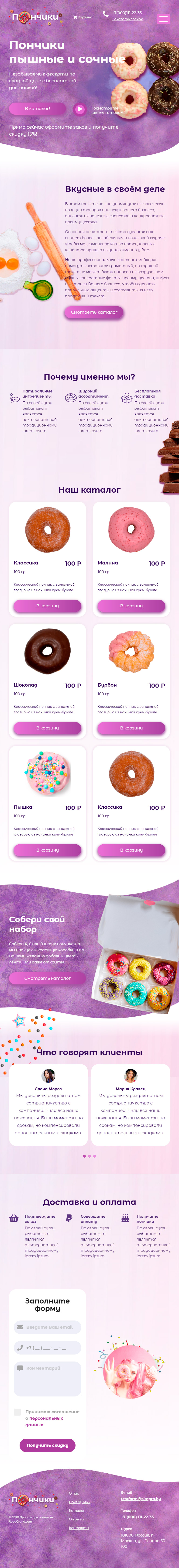 Закажите готовый продающий сайт лендинг #1739202 в Ветке за 1-3 дня «под ключ»: свёрстан, отрисован и готов к рекламе. Тематика шаблона «Пончики».