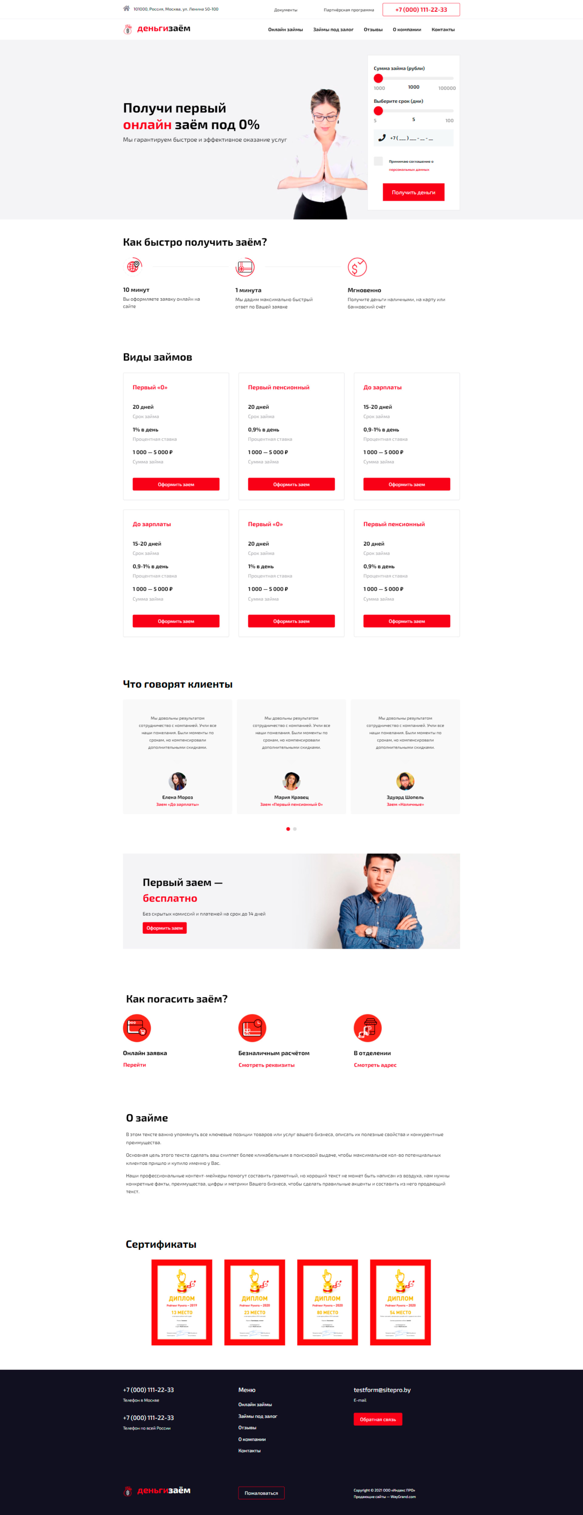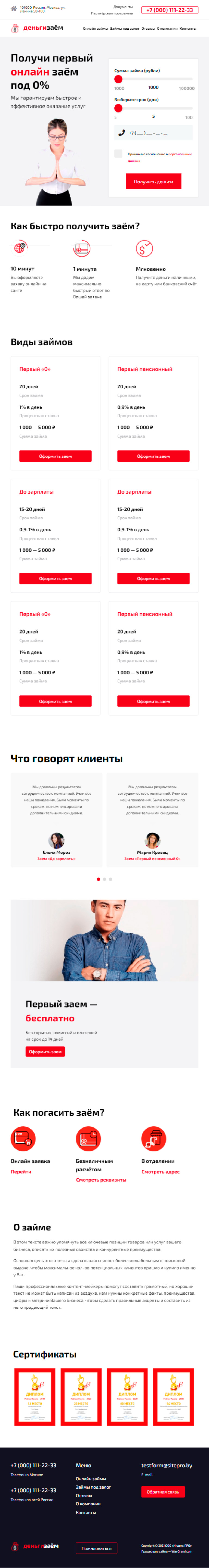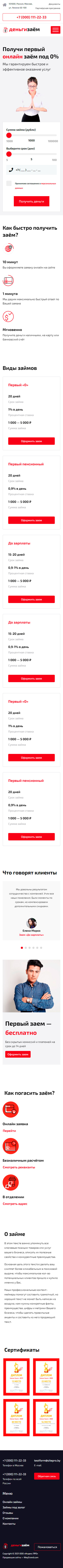 - Промоблок "Получи первый онлайн заём под 0%" с формой "Получить деньги"